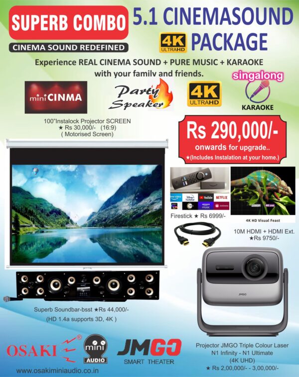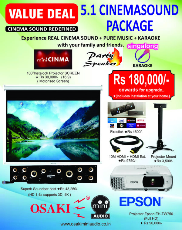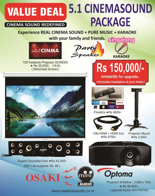 Superb combo deal is Osaki Superb soundbar 5.1 channel Dolby Prologic II Cinema Sound experience with projector equivalent to Optoma W400Lve and 100″ , 16:9 Cinema Projection screen at nearest dealer.